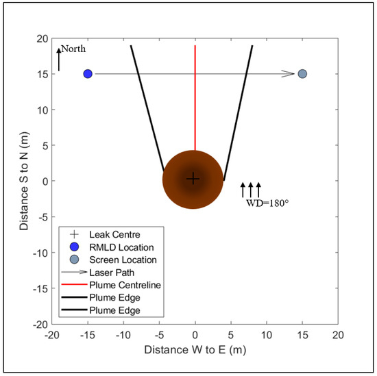 Top-view schematic representation of the surface expression of a leak, location of the RMLD, and the screen during an experiment when the wind direction is 180° (from the south). The emission radius is set at 4 m to represent the distance of surface gas migration from the leak center. The plume centerline has the highest concentrations of CH4, and the concentrations decrease towards the plume edge. The above-ground setup was as follows: (i) The reflective screen was located directly opposite the RMLD in all experiments, (ii) the combination was positioned 15 m downwind of the leak, and (iii) the path length was set perpendicular to the wind direction.