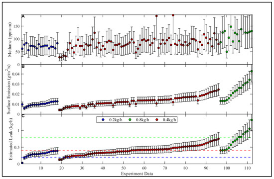 Plot (A) shows the 10 min averaged CH4 mixing ratios from measurements sampled using the RMLD, plot (B) is the surface emission as derived by the bLs model using CH4 mixing ratios, and plot (C) is the estimated leak rate as derived by the ESCAPE−1 model using the surface-emission. The blue, red, and green dotted lines in plot (C) are the 0.2, 0.4, and 0.8 kg CH4 h−1 controlled release rates, respectively. Error bars in plot A represent the uncertainty (±50%) due to the CH4 mixing ratios. Error bars in plots (B,C) represent the uncertainty (±25%) in the modeling approach.