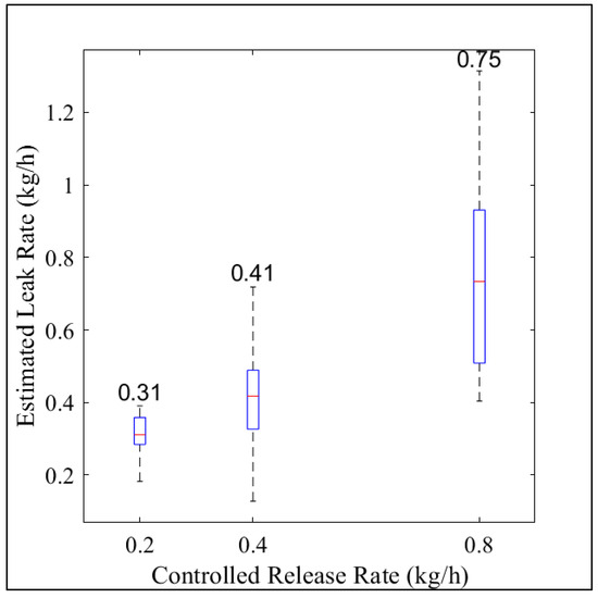 Estimated leak rates from 0.2, 0.4, and 0.8 kg CH4 h−1 controlled release rates, respectively. The red line inside the box represents the median value, the boxes represent the 25th and the 75th percentiles, and the dotted black lines (the whiskers) represent ±1.5 times the interquartile range. The numbers inside the plot represent the mean estimated leak rate in each controlled release rate. The numbers of data points used are 17, 77, and 15 points in the 0.2, 0.4, and 0.8 kg CH4 h−1 controlled release rates, respectively.