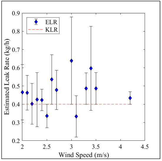 Average estimated leak rate at wind speeds from 2 to 4.5 m s−1. The red line is the known leak rate (KLR), and the blue points are the estimated leak rates (ELR). Error bars represent the RMSE from the known leak rate. The model underestimates the leak rate when the wind speed is below 2 m s−1. Data from the 0.4 kg CH4 h−1 controlled leak rate were used to generate this plot.