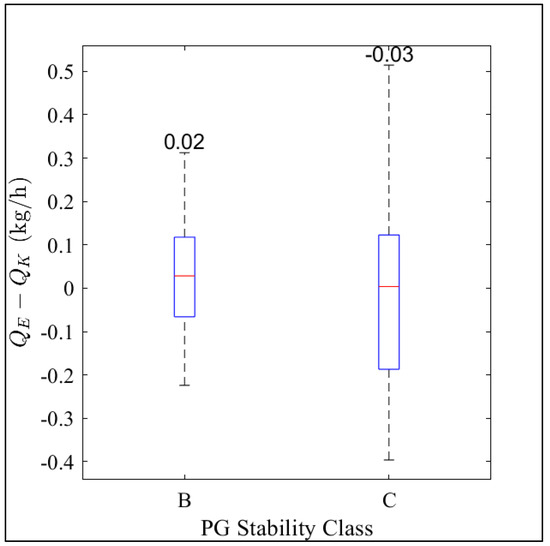 Difference between the estimated and the controlled release rate (QE − QK) in PGSC B and C. The red lines inside the boxes represent the median value, while the boxes represent the 25th and the 75th percentiles. The dotted black lines (the whiskers) represent ±1.5 times the interquartile range. The numbers inside the plots represent the average difference in each stability class. The numbers of data points used are 73 and 27 in PGSC B and C, respectively. PGSC A was not used in the plot because it has few data points (6) after filtering for WS and changes in WD. Also, PGSC D was not used in the plot because it has 6 data points and represents the neutral conditions of the atmosphere.