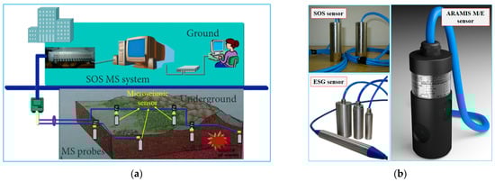 Microseismic monitoring system and microseismic sensor: (a) Configuration of SOS microseismic monitoring system within a mine; (b) microseismic sensors designed for coal mines.