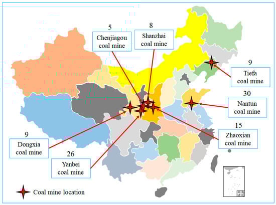 The MS utilized in the test were DLM-type MS sourced from seven coal burst-prone mines after undergoing underground usage for a minimum duration of one year. Each sensor underwent an initial screening process to verify its circuitry’s integrity and compatibility for attachment to the screws. Figure 3 displays the geographical distribution of the sampled coal mines and the respective MS number within each mine. A total of 102 SOS sensors were available for testing purposes.