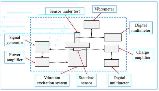 The system connection through the comparative method is illustrated in Figure 4. The signal generator produces electrical signals of a specific frequency and vibration velocity, which are subsequently amplified by the power amplifier before being fed into the vibration excitation system. The standard sensor detects the vibration excitation system’s vibration state, provides feedback to the signal generator, and employs a negative feedback mechanism to regulate the vibration signal. The standard sensor enhances the electric signal using a charge amplifier and transmits it to a digital multimeter. The standard sensor’s vibration velocity and frequency can be exhibited after signal conversion and data processing. The sensor under test is mounted onto the vibration excitation system to gather the vibration parameters. Upon establishing a connection with the sensor, the digital multimeter showcases the vibration frequency, velocity, and other parameters measured by the sensor. Ultimately, a comparison is made between the vibration parameters of the signal generator and the sensor under test to verify the operational status of the MS.