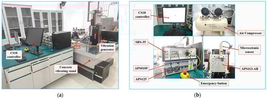 MS are considered precision instruments, necessitating a meticulously controlled testing environment. According to the Chinese industry standard document, the construction of the concrete vibration table base must adhere to stipulated guidelines []. Furthermore, ensuring that the testing environment and its surroundings are devoid of vibrations, impacts, strong electric fields, strong magnetic fields, and high-intensity sound fields is imperative. This assurance establishes an environment for testing the MS that is maximally free from interference. The testing environment for the MS is depicted in Figure 5a.