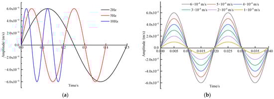 Precisely capturing the frequency and amplitude of vibration signals stands as the core function of an MS, directly influencing the reliability of an MMS. Within the operational frequency range of the DLM-type MS (0.1~200 Hz), we chose seven representative frequencies for calibration: 2, 5, 10, 20, 50, 100, and 150 Hz. The selected amplitude during the frequency calibration was 6 × 10−4 m/s, falling within the functional amplitude range of the DLM-type MS (1 × 10−6 m/s ~ 6.4 × 10−4 m/s). For the amplitude calibration, we held the frequency steady at 50 Hz and utilized the CS18VLF to generate six distinctive amplitudes: 6 × 10−4, 5 × 10−4, 4 × 10−4, 3 × 10−4, 2 × 10−4, and 1 × 10−4 m/s, respectively. Standard sinusoidal waveforms were chosen for both frequency and amplitude calibration; Figure 6a,b depict the input waveforms utilized for frequency and amplitude calibration.
