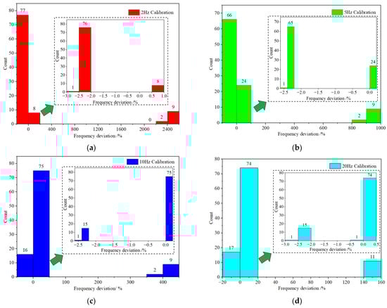 For a more comprehensive analysis of the frequency calibration outcomes, as illustrated in Figure 8, we meticulously tabulated the frequency deviations of the measured MS for each calibration frequency. Figure 8 demonstrates that the test results of certain MS exhibit significant deviations from the expected values at certain calibration frequencies. For instance, during the 5 Hz calibration, there are 11 MS with frequency deviations ranging between 800% and 1000%, considerably surpassing the established normal range. It was discerned that these 11 MS did not function correctly due to substantial biases present at each calibration frequency. Upon eliminating the aberrant values, the frequency deviation of the majority of MS at each calibration frequency fell within a narrow spectrum. For instance, at 10 Hz, the frequency deviation of 75 MS ranged from 0% to 0.2%. This pattern persisted across other calibration frequencies, underscoring the method’s efficacy in discerning non-operational MS.