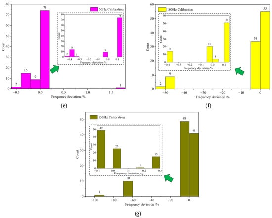Statistical distribution of tested sensor frequency deviation at various test frequencies: (a) 2 Hz; (b) 5 Hz; (c) 10 Hz; (d) 20 Hz; (e) 50 Hz; (f) 100 Hz; (g) 150 Hz.