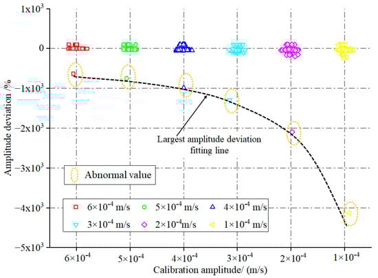 In total, 102 MS underwent testing on the CS18VLF, following the procedure outlined in Section 2.3.2. Subsequently, the amplitude deviation index was computed using Equation (2). As depicted in Figure 9, we conducted amplitude testing on 102 MS and computed their amplitude deviations using Equation (2). Analogously to the frequency calibration, we observed that the maximum amplitude deviation value escalates as the calibration amplitude decreases. Notably, at the 1 × 10−4 m/s calibration, the maximum amplitude deviation of one MS reaches −4000%. This trend could stem from the reduction in the amplitude during calibration, leading to a decrease in the denominator of Equation (2), consequently resulting in an elevation of the amplitude deviation.