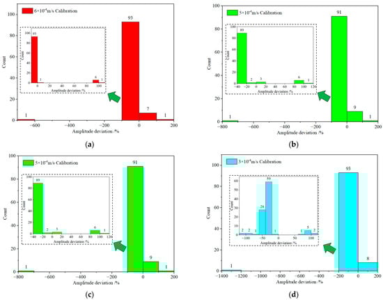 We graphed the outcomes separately for each calibration amplitude for a more granular analysis of the amplitude test results, as illustrated in Figure 10. This figure reveals that regardless of the calibration amplitude, the overwhelming majority of MS exhibit amplitude deviation values proximate to the norm, with only a small minority of MS demonstrating significant deviations from the expected range. Figure 10 illustrates the following observations for different calibration amplitudes: At the calibration amplitude of 6 × 10−4 m/s, 93 MS exhibit amplitude deviations ranging from −10% to 0; during the 5 × 10−4 m/s calibration, 89 MS display amplitude deviations between −40% and −20%; t the 4 × 10−4 m/s calibration, 62 MS manifest amplitude deviations within the range of −40% to −20%; with the calibration amplitude set at 3 × 10−4 m/s, 59 MS demonstrate amplitude deviations spanning from −40% to −20%; when calibrating at 2 × 10−4 m/s, 84 MS showcase amplitude deviations in the range of −50% to 0. Similarly, at the calibration amplitude of 1 × 10−4 m/s, 86 MS exhibit amplitude deviations between −50% and 0. These results imply that as the calibration amplitude diminishes, the number of MS that satisfy the given condition gradually decreases. Moreover, each calibration amplitude has a limited number of MS with amplitude deviations significantly beyond the normal range, signifying improper functionality. It is evident that the test can differentiate MS with abnormal measurement amplitudes.