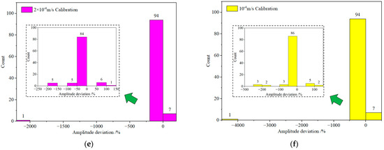 Statistical distribution of tested sensor amplitude deviation at various test amplitudes: (a) 6 × 10−4 m/s; (b) 5 × 10−4 m/s; (c) 4 × 10−4 m/s; (d) 3 × 10−4 m/s; (e) 2 × 10−4 m/s; (f) 1 × 10−4 m/s.