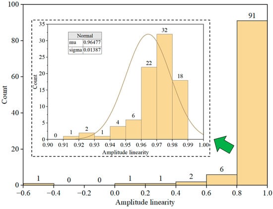 Amplitude deviation analysis enables the assessment of accuracy in measuring different amplitudes using MS, while amplitude linearity analysis evaluates the consistency of measurements across varying amplitudes. The data source for amplitude linearity is identical to that of amplitude deviation. The amplitude linearity is calculated as demonstrated in Equation (3). As depicted in Figure 11, the statistical distribution results of amplitude linearity for the 102 MS are presented. Figure 11 shows that 91 out of the 102 MS exhibit amplitude linearity within the range of 0.8 to 1. Upon deeper analysis, it was observed that among these, 72 MS exhibit amplitude linearity between 0.96 and 0.99. This suggests that the majority of the MS demonstrate a strong level of amplitude linearity, affirming the stability and reliability of the amplitude testing for these MS.