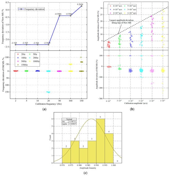 Comparative analysis of amplitude–frequency calibration results for new and old MS: (a) Comparative frequency deviation between new and old MS; (b) comparative amplitude deviation between new and old MS; (c) statistical distribution of amplitude linearity for new MS.