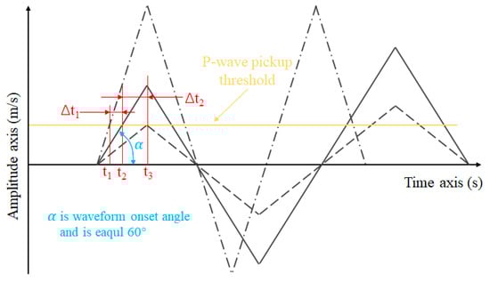 Given the complexity of actual vibration waveforms, a simplification was made using a triangular waveform (as shown in Figure 13) for computational analysis. As illustrated in Figure 13, in cases of positive amplitude deviation, the P-wave’s initial arrival time shifts to an earlier point, denoted as . Conversely, when experiencing negative amplitude deviation, the P-wave’s initial arrival time shifts to a later point, represented by . Notably, the extent of this shift in the P-wave’s arrival time corresponds directly to the absolute value of the amplitude deviation. In simpler terms, when there is a larger amplitude deviation, the P-wave’s arrival time shift becomes more noticeable compared to its expected timing. This emphasizes how amplitude deviation can significantly affect the accuracy of determining when the P-wave initially arrives, which impacts how precisely we can locate the source of the microseismic event. If the amplitude deviation becomes substantial, it could even make identifying the P-wave’s initial arrival difficult, potentially leading to the event going undetected.