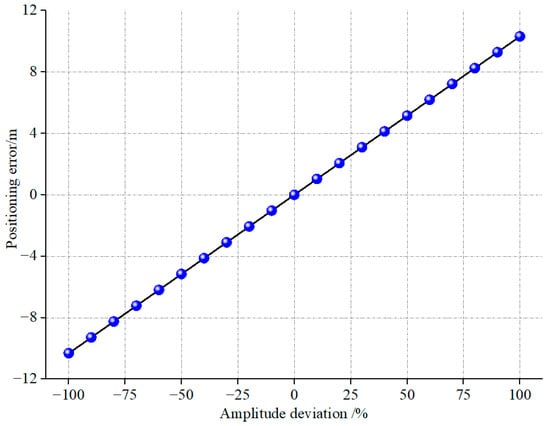 Equation (5) uses assumed values for , , and ( = 60°, = 5500 m/s, = 6 × 10−4 m/s) to establish a mathematical relationship. This relationship elucidates the influence of the parameter on the quantity , and its result is then graphically depicted in Figure 14. The figure portrays that within the context of the assumptions above when the amplitude deviation reaches 100%, the resulting positioning error extends to 10.3 m. It is important to note that this outcome is an oversimplified representation. The actual scenario is significantly more intricate, encompassing various factors contributing to the positioning error.