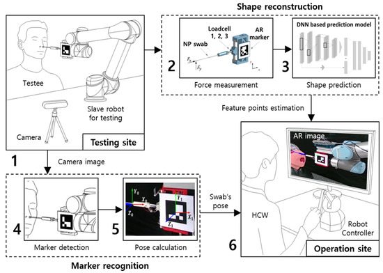 System overview of AR-based visual feedback system. (1) Nasopharyngeal sampling under automated environment. (2) Measuring contact force from the sampling device. (3) Estimating the exact location of feature points. (4) Recognizing markers from camera images while sampling. (5) Calculating the pose of the sampling device from the attached fiducial marker. (6) Delivering AR-based guides regarding the shape of the nasopharyngeal swab.