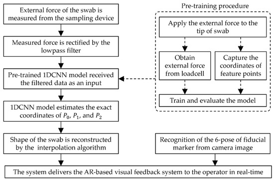 This study proposes an AR-based visual feedback system that predicts the shape of an NP swab inserted inside the nasal cavity. As illustrated in Figure 1, the system generates the shape of the swab based on the contact force and fiducial markers and transmits these data to the operator via monitoring devices. The contact force applied to the swab was measured using a sampling device with three embedded load cells. The contact forces were synchronized with the coordinates of the feature points of the swab obtained using motion-tracking software. To determine the approximate shape of the swab, we adopted a 1DCNN-based structure. This model predicts the x- and y-coordinates of the three feature points using the rectified contact force as its input. The intermediate points, which comprised the continuous curve of the swab, were calculated from the estimation output. With a six-pose fiducial marker on the sampling device, the reconstructed shape of the swab was delivered to an AR environment. A flow chart of the research methodology given above is illustrated in Figure 2.