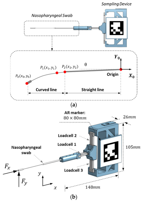 Modeling and apparatus for swab reconstruction. (a) Coordinate systems for feature points of nasopharyngeal swab and (b) configuration of the sampling device.