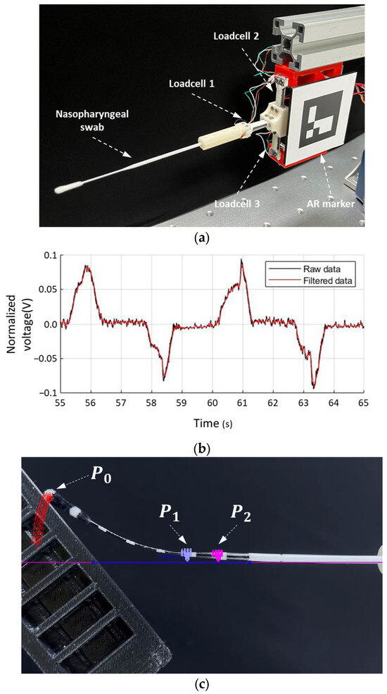 Data acquisition method from loadcell and tracking program. (a) Device setting for measurement; (b) raw and rectified loadcell data; and (c) three tracking points of nasopharyngeal (NP) swab.