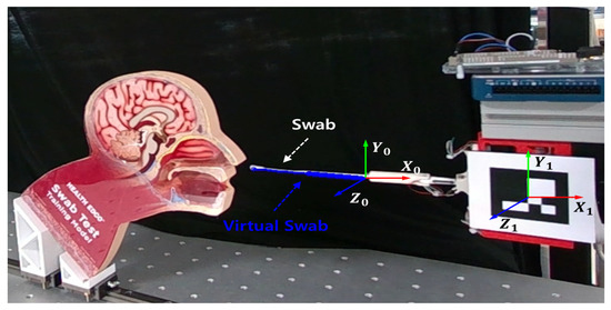 Reconstructed swab on the camera image. NP swab (white) is overlain with the virtual swab (blue) attached to the end of the swab holder (coordinate system 0).