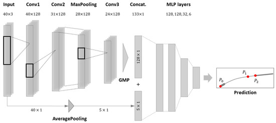 The structure of the estimation model is composed of a 1DCNN and an MLP, as shown in Figure 6. The three-channel measured data were reshaped into a time-series input with a window size of 40 ms. After this input is delivered to the CNN layers, a global max pooling (GMP) layer extracts the maximum features of the filtered data. The GMP reflects the general tendency of multiple sensors and diminishes their dimensions. As load cell 1 is the dominant observer of the vertical force, the residual connection provides a detour for the undeterred information of load cell 1 after passing through an average-pooling layer. In addition, a concatenate layer merges the data from the CNN and residual layer. Subsequently, the concatenated data were sent to an MLP, stacking multiple layers to reflect the nonlinearity of the dataset. The final output contains information about the exact coordinates of the feature points , , and . In addition to the last layer of the MLP, a rectified linear unit was adopted as an activation function for the CNN and MLP layers. Furthermore, a hyperbolic tangent function was chosen as the last function for nonlinearity.