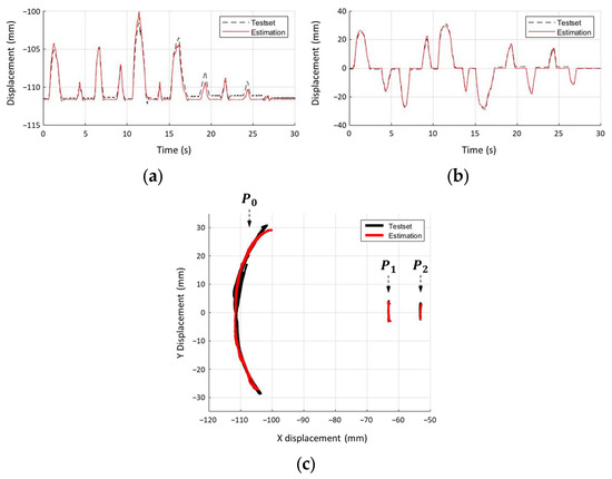 For the training procedure, the mean square error (MSE) was used as a loss function, and the adaptive moment estimation (Adam) was used as an optimizer. The early stopping function, which incorporated patience, monitored and saved the trained model while reaching its limit of improvement. When the training and validation losses reached 5.1621 × 10−5 and 1.0462 × 10−4, respectively, the training procedure was stopped after seven epochs. The root MSEs of the three feature points were calculated as 0.4927, 0.1589, and 0.0968 for x and 0.0620, 0.7986, and 0.1069 for y. Figure 7a,b shows the training and estimated x- and y-values of the feature point , while the 2D locus of point is shown in Figure 7c. The predicted points (red dots in Figure 7c) appear to be less disturbed by external noise than the raw tracking data (black dots in Figure 7c).