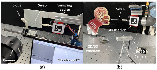 Recent studies have focused on robotic-based systems for swab sampling to reduce the burden on HCWs and improve the working environment. First, the basic forms of these automated robots are designed to replace the sampling motion only [5,6,7]. However, these systems still require a significant human workforce for the preparation of tasks such as attaching, cutting, and disposing of swabs. To overcome these challenges, some studies have expanded the functionality of the robots so that they can replace most of the tasks [8,9,10,11]. These robotic systems are designed to automatically recognize the location of the suspected COVID-19 patients using camera vision and to follow the sampling path. In particular, the teleoperated system enables nasopharyngeal (NP) sampling, which is more difficult to achieve but has higher diagnostic accuracy than oropharyngeal (OP) sampling [12]. However, with confined images from the camera attached to the end of the manipulator [8,9,10,11,13], teleoperation can lead to incorrect sampling and may damage the nasal vestibule roof and septum, causing severe pain or bleeding [14,15].