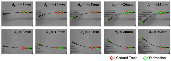 Figure 9 shows the 2D sampling experiments under ten bending conditions. The error and standard deviation of each feature point were calculated from the measured data, as presented in Table 1. The results showed that the predicted points were biased toward the x-coordinates with a small distribution. In particular, the biased error of and () was larger than that of (), which was as attributed to the influence of the initial position setting of the feature points. The results for the y-coordinate showed distinct trends in the positive (5–25 mm) and negative (−5 to 25 mm) bending directions. A uniform error of less than 1 mm was observed in the positive bending direction. Conversely, the error in the negative direction increased with the amount of deformation. However, the same level of standard deviation was observed in both directions. Owing to the tip of the swab being subjected to the largest displacement, the largest error was observed at the feature point . The average positions of the ground truth of the three feature points (red diamonds with centered dots) and the estimation points (green diamonds with centered dots) are marked in Figure 9 to visualize the error.