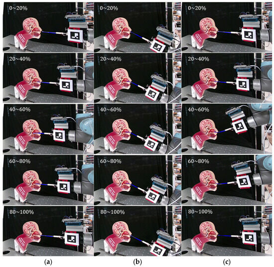 Figure 11 shows the procedure of the NP sampling experiment for the 3D phantom. The experiments were performed according to three scenarios identical to the conditions of the 2D phantom experiments. In a successful sampling situation (Figure 11a), the swab passed straight through the nasal cavity and contacted the NP wall. Because the nasal cavity was made of soft material, the swab formed an almost straight line with slight bending. Conversely, the swab was deformed by contact with the upper and lower parts of the nasal cavity (Figure 11b and Figure 11c, respectively).
