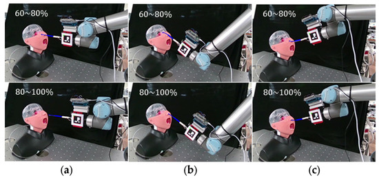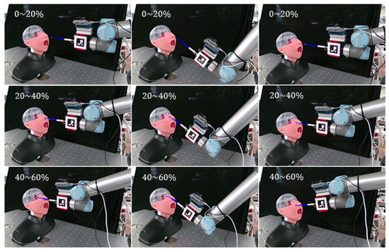 The system performance was validated in 3D environments and imitated actual sampling conditions. Figure 8b presents the experimental setup for the 3D sampling experiment. Both 2D and 3D phantoms were used as substitutes for patients suspected of being infected. The transparent cover of the 2D phantom allowed the interior of the nasal cavity to be visualized. Despite the invisibility of the internal structure of the 3D phantom model, the AR model of the swab helps to evaluate the approximate shape and location in real time. The swab was inserted using an UR5 robot arm (Universal Robots, Inc., Odense, Denmark) to emulate a remote sampling environment. Three cases of insertion were supposed to reflect various deformations: (1) normal sampling (0°), (2) excessive contact with the upper nasal cavity (30–40° range), and (3) excessive contact with the lower nasal cavity (−20 to 30° range). An NP swab (SG Medical, Seoul, Republic of Korea) was fixed to the swab holder after insertion at 40 mm. The RGBD camera tracked the fiducial marker to visualize the AR images using its position and orientation. The final AR images were delivered to the monitor and recorded for each sampling sequence. Furthermore, for every case in the experiments, each sequence took approximately 910 s.