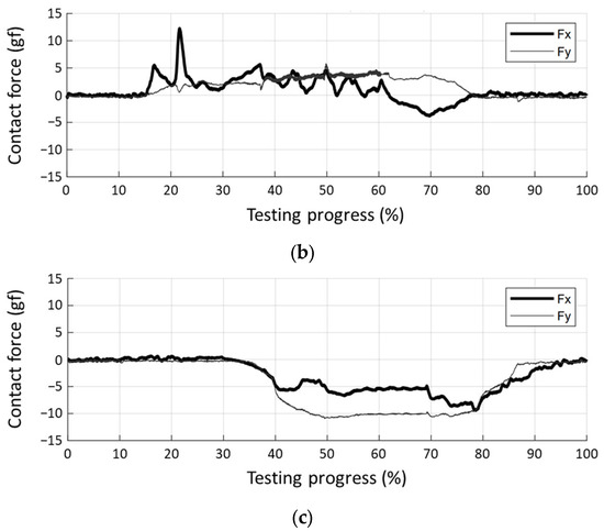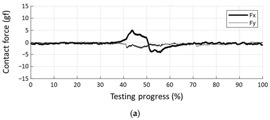 The contact force and reconstructed shape of the NP swab entering the 3D phantom are presented in Figure 12 for the three scenarios. The contact force measured in the x- and y-directions using load cells attached to the sampling device was plotted for a single sampling epoch. In the successful sampling shown in Figure 12a, the y-direction force was within 3 g with minimal contact with the nasal cavity. The x-direction force was positive and negative before and after reaching the deepest insertion area (approximately 50% of the progress). This seems to be caused by friction acting in a direction opposite to the movement of the swab. During sampling with excessive contact, a relatively large y-direction contact force was observed. In particular, a strong contact with the top side of the interior (Figure 12b) resulted in a large x-direction force. Conversely, contact with the bottom side (Figure 12c) generated mostly a negative x-direction force. This is because the swab contact mostly occurred during withdrawal (after 40% of progress) after the deepest insertion.
