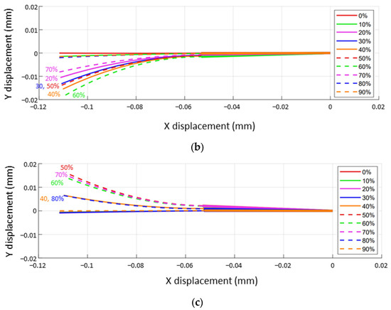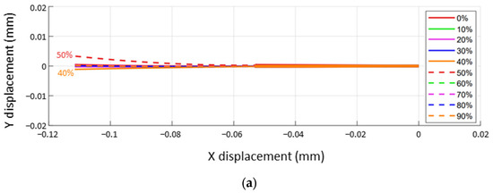 Figure 13 shows the reconstructed shape of the swab within the 3D phantom based on the predicted points. Each shape was distinguished by the brightness of the lines according to the levels of sampling progress. For successful sampling shown in Figure 13a, most of the shapes remained straight because a slight contact force occurred in the y-direction. As shown in Figure 13b, when the contact in the upper part was excessive, the tip of the swab was bent in the negative y-direction. In Figure 12b, swab bending occurred during 20–70% of the sampling progress, where large contacts in the y-direction were made. For the excessive contact at the bottom in Figure 13c, the bending in the positive y-direction occurred during 40–80% of the progress owing to contact with the interior.