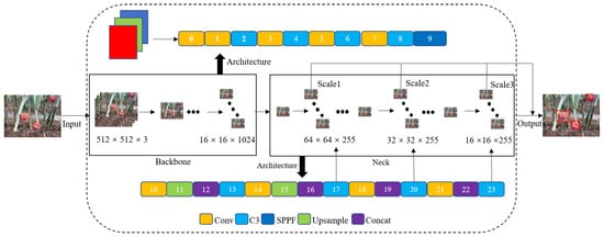 The YOLOv5 architecture offers four variants, distinguished by the network’s depth and width: YOLOv5-s, YOLOv5-m, YOLOv5-l, and YOLOv5-x. Among these, YOLOv5-s is the smallest model with the fastest inference speed, making it ideal for deployment on edge detection devices. In this study, we employed the YOLOv5-s network model, as depicted in Figure 3, which comprises four key components: Input, Backbone, Neck, and Output. The Input module performs essential pre-processing tasks on the dragon fruit images, including adaptive scaling and data augmentation using Mosaic. The Backbone module, consisting of C3 and SPPF structures, focuses on feature extraction from the input image. The C3 module divides the basic feature layer into two parts. One part conducts convolutional operations, while the other part fuses with the convolutional operation results of the first part through cross-layer combination to obtain the feature layer. The SPPF structure plays a crucial role in aggregating multi-scale features obtained from C3 to effectively expand the image’s receptive field. In the Neck module, the FPN+PAN structure is employed to fuse features extracted from different layers. FPN facilitates the propagation of features from top to bottom layers, while PAN enables the propagation of features from bottom to higher layers. By combining both approaches, features from diverse layers are fused to mitigate information loss. The Output module generates feature maps of various sizes. By analyzing these feature maps, the location, class, and confidence level of the dragon fruit can be predicted. In this study, 5000 images containing dragon fruit flowers and fruits were used as the training dataset. The information about the dataset was listed in Table 1.