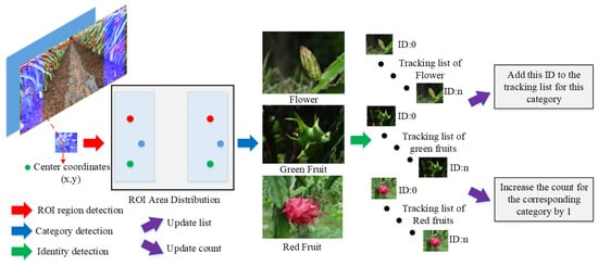 The counting method, as illustrated in Figure 6, involves two primary steps. (1) Frame-by-frame analysis: The center coordinates of the identified dragon fruit target box are assessed to determine if they fall within the designated ROI counting region. If they do not, the process is repeated. If the coordinates are within the ROI counting region, the procedure proceeds to the next step. (2) Categorization and tracking: The category of the flower/fruit target entering the ROI region is confirmed, and the corresponding category’s tracking list is checked for the presence of the target’s ID. If the ID is not already included in the tracking list, it is added, and the counter for the respective category is incremented by 1. If the ID is already present in the tracking list, it is not counted. Once all video frames have been analyzed, the tracking lists for all categories within the ROI region are cleared.