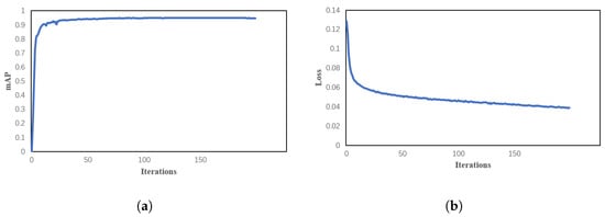 The training progress of the YOLOv5 model for dragon fruit recognition is depicted in Figure 7, illustrating the curves for loss and mAP. Notably, the loss exhibits a rapid decline while mAP experiences a substantial increase throughout the training iterations. As training progresses, the loss value gradually converges towards the minimum of 0.04, reaching this threshold after approximately 150 iterations.