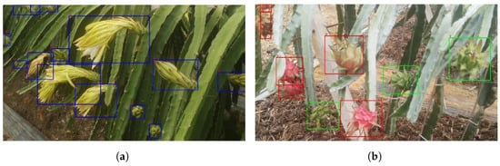 The recognition results obtained by the YOLOv5 model for dragon fruits in different growth stages. (a) Detection results of different types of dragon fruit flowers, and (b) detection results of red and green fruits.