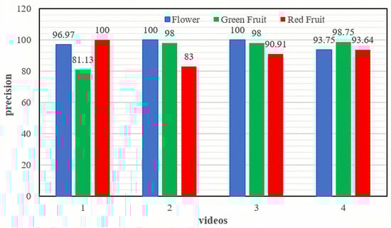 To evaluate the performance of the counting method proposed in this study, four videos collected from different locations and times, as outlined in Table 3, were utilized. The obtained results, as illustrated in Figure 9, reveal notable insights. Notably, the counting accuracy for red fruits in Video 1 and flowers in Video 2 achieved a perfect score of 100%. However, the counting accuracy for green fruits in Video 1 and red fruits in Video 2 was comparatively lower, standing at 81.13% and 83%, respectively. Conversely, the counting accuracy for flowers in Video 3 and green fruits in Video 4 demonstrated the highest performance, reaching 100% and 98.75%, respectively. Nevertheless, the counting accuracy for red fruits in these videos was relatively lower, at 90.91% and 93.64%, respectively. These results robustly demonstrate the accuracy of the proposed counting method in effectively enumerating dragon fruits at various growth stages within orchard environments.