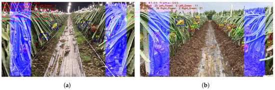 Figure 8 presents the actual image recognition results obtained from the YOLOv5 model. The recognition outcomes are indicated by blue, green, and red boxes, corresponding to flowers, green fruits, and red fruits, respectively. In Figure 8a, the image highlights the significant variation in the size and shape of dragon fruit flowers due to factors such as blooming stage and shooting angle. Despite this challenge, the YOLOv5 detection model demonstrates the precise identification of the flowers. Figure 8b shows the recognition of green and red fruits in their coexisting state, where the detection model accurately distinguishes and identifies both types of fruits. This successful recognition serves as a crucial foundation for subsequent counting of dragon fruits across various growth stages.
