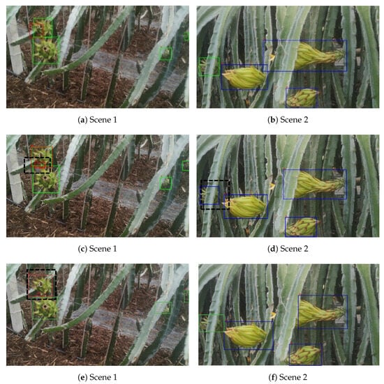 Figure 11 depicts the detection performance of the three models under the same confidence level of 0.5 in two typical scenarios. Specifically, Figure 11a,b exhibits the detection results of YOLOv5, Figure 11c,d displays the results of YOLOX, and Figure 11e,f depicts the outcomes of YOLOv3-tiny. A comparative analysis of the detection results highlights that YOLOX and YOLOv3-tiny are more susceptible to false positives and false negatives when objects are occluded. For example, in Figure 11c, a single occluded red fruit target is mistakenly identified as two separate red fruit targets. In Figure 11d, an occluded green fruit target is incorrectly recognized as a dragon fruit flower. Additionally, Figure 11e shows a missed detection of a green fruit target. The experimental findings emphasize that YOLOv5 exhibits superior detection accuracy and faster detection speed compared to the other models. Moreover, YOLOv5 demonstrates enhanced robustness in occluded environments, rendering it more suitable for effectively detecting dragon fruit targets at various growth stages.