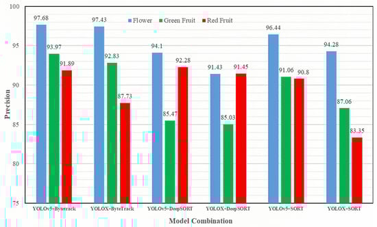 The combination of YOLOv5 and ByteTrack exhibited the highest counting accuracy of 97.68% for flower counting. For the counting results of green and red fruits, the combinations of YOLOv5 and ByteTrack, as well as YOLOv5 and DeepSORT, achieved the most favorable results, with counting accuracies of 93.97% and 92.28%, respectively. Analyzing the object detection aspect, the counting results obtained from the YOLOv5 algorithm combination generally surpassed those of the YOLOX algorithm combination. This suggests that YOLOX yielded more false detections during the detection process, consequently introducing more counting errors. Considering object tracking, ByteTrack outperformed DeepSORT and SORT when utilizing the same object detection input. The superior performance of ByteTrack can be attributed to its ability to sustain attention on detection targets with lower confidence scores, often corresponding to occluded targets. By emphasizing attention on these targets, ByteTrack facilitates tracking a higher number of targets simultaneously, ultimately leading to improved counting results.