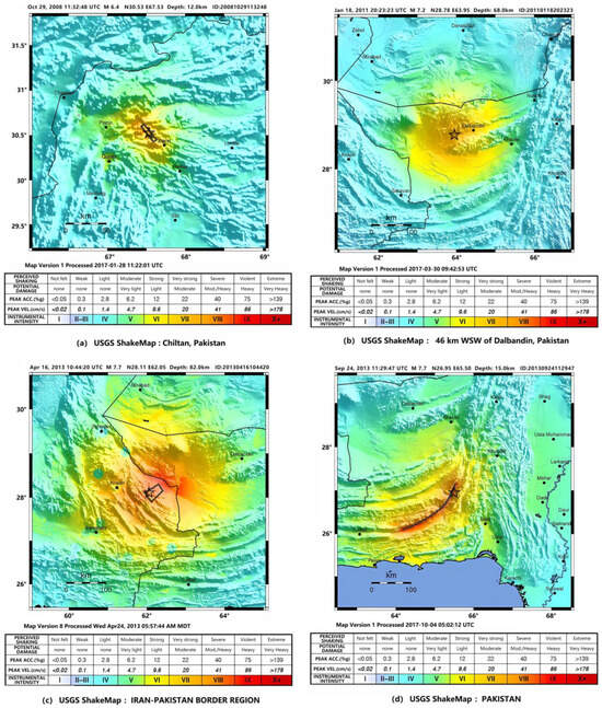 The tectonics of this investigated region is dominated by the collisions of the Arabian and Indian plates with Eurasia. The Arabian plate lithosphere subducts beneath the Eurasian plate at the Makran coast of Pakistan and Iran, and extends progressively deeper to the north [29]. Four major tectonic plates (Arabia, Eurasia, India, and Africa) and one smaller tectonic block (Anatolia) are responsible for seismicity in the Middle East and surrounding region. The geologic evolution of this region is a consequence of several first-order plates’ tectonic processes including seductions, large-scale transform faulting, compression mountain building, and crustal extension. Continental thickening of the northern and western edge of the India subcontinent has produced the highest mountains in the world, including the Himalayan, Karakoram, Pamir, and Hindu Kush ranges. Earthquake activity and faulting found in this region as well as adjacent parts of Afghanistan and India are due to collisional plate tectonics. Shallower crustal earthquakes in the Pamir-Hindu Mountains occur primarily along the Main Pamir Thrust and other active Quaternary faults, which accommodate much of the region’s crustal shortening. From 2007 to 2016, 4 earthquakes with Mw 6.0+ occurred in this region; the ShakeMaps of the main shocks are shown in Figure 2 and the source is the following website: (a) https://earthquake.usgs.gov/earthquakes/eventpage/usp000gma2#shakemap, (accessed on 1 July 2023); (b) https://earthquake.usgs.gov/earthquakes/eventpage/usp000htb4#shakemap, (accessed on 1 July 2023); (c) https://earthquake.usgs.gov/earthquakes/eventpage/usb000g7x7#shakemap, (accessed on 1 July 2023); (d) https://earthquake.usgs.gov/earthquakes/eventpage/usb000jyiv#shakemap, (accessed on 1 July 2023). In Figure 2, the star marks the epicenter, and the lines around the star represent the rupture direction of the earthquake.