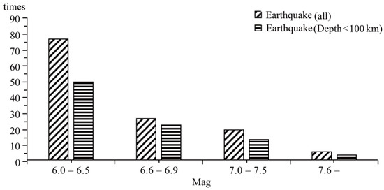 This region had strong seismic activity from 1900 to 2016, including 130 earthquakes (100 shallow earthquakes) of magnitude 6+, as shown in Figure 3, and the source is the following website: https://earthquake.usgs.gov/earthquakes/search/, accessed on 10 July 2023, Date: 1 January 1990–31 December 2016. The number of earthquakes decreased as magnitude increased. Previous studies have found that the thermal radiation anomalies of shallow earthquakes are more obvious and easier to extract. Therefore, we focused on analyzing shallow-source seismic activity.