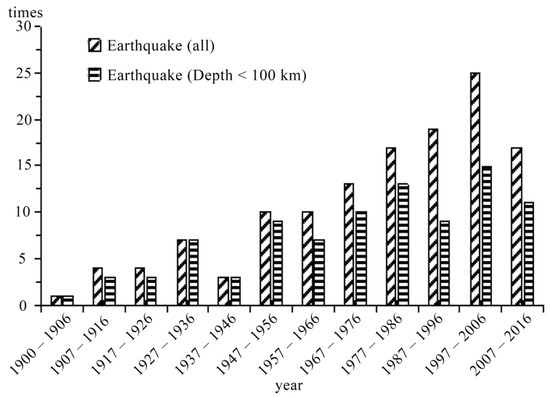 Since 1900, the frequency of earthquakes per decade has gradually risen, peaking between 1997 and 2006, as shown in Figure 4, and the source is the following website: https://earthquake.usgs.gov/earthquakes/search/, accessed on 10 July 2023, Date: 1 January 1990–31 December 2016. Earthquakes occurred less frequently before 1947, which may be associated with poor seismic 87c monitoring capacity and record keeping. Since 1947, the number of shallow earthquakes per decade has continuously increased. The last decade generally reflects the region’s average seismic activity; therefore, its thermal radiation background information should be representative as well.