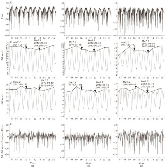 In Figure 5a, the raw data exhibit distinguishable annual variations caused by season alternation. Due to the short-term weather changes, the fluctuations of the data are relatively large, which can be handled by wavelet analysis. By applying the sixth and seventh order wavelet transform, it is possible to separate the approximate annual period (sixth scale) and annual period (seventh scale) change information, respectively. The seventh scale has a longer period, which is closer to one year. Figure 5b,c show that Mw 7+ can cause changes in the annual period (seventh scale) and approximate annual period (6th scale) background curves. Also, three earthquakes occurred in the background transition.