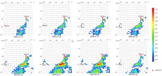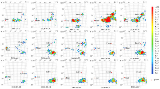 As shown in Figure 6, the anomaly lasted about 70 days from 21 July 2008 to 29 September 2008. The maximum amplitude of the anomaly occurred on 5 August 2008, reaching more than 10 times the average value. The area of the anomaly was close to the double-shock epicenter, with the expansion direction nearly parallel to the line connection of these two epicenters (E(a), E(b)). The temporal and spatial evolution of the anomaly was clear and easy to extract and identify. The anomaly evolution presents a three-stage process of the abnormal occurrence–maximum–disappearance, in line with the earthquake propagation process.