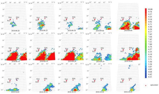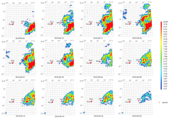 The anomaly duration of these earthquakes was also about 70 days from 20 August 2010 to 29 September 2010, as shown in Figure 7. The maximum amplitude of the anomaly reached more than 10 times the average value on 14 September 2010. The anomaly center was close to the Mw 7.2 epicenter. The anomalous shape is consistent with the ShakeMap of Figure 2b, which is mainly located in the southern epicenter.