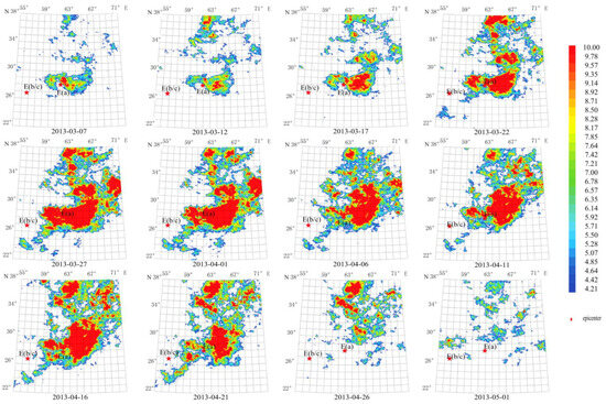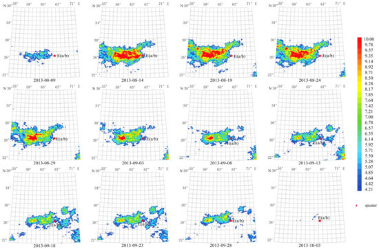 The anomaly slightly extends from the epicenter to the southwest direction in an elliptical shape, which is consistent with Figure 2d. Its width along the south–north direction is shorter than the anomaly in Figure 9. The duration of this anomaly was about 55 days from 9 September 2013 to 3 October 2013. The maximum amplitude of the anomaly appeared during 14 August 2013 to 24 August 2013, reaching more than 10 times the average value.