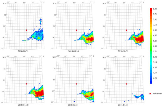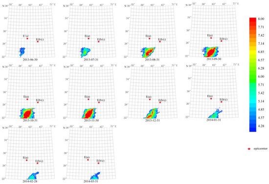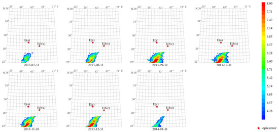 The duration of the first anomaly was about 6 months from 31 July 2013 to 31 January 2014 (Figure 14). The maximum amplitude occurred from 30 September 2013 to 31 December 2013, which is eight times the average value. The second anomaly lasted about 9 months from 30 June 2013 to 31 March 2014. The maximum amplitude occurred from 30 September 2013 to 31 November 2013, which is also about eight times the average value. The shape of these two anomalies is similar to that of the ShakeMap provided by the USGS for the Mw 7.7 earthquakes (Figure 2d). These two anomalies showed similar characteristics, but their appearance and lasting time are obviously different. Specifically, the seventh-order anomaly appeared 1 month earlier and lasted 3 months longer than the sixth order one.