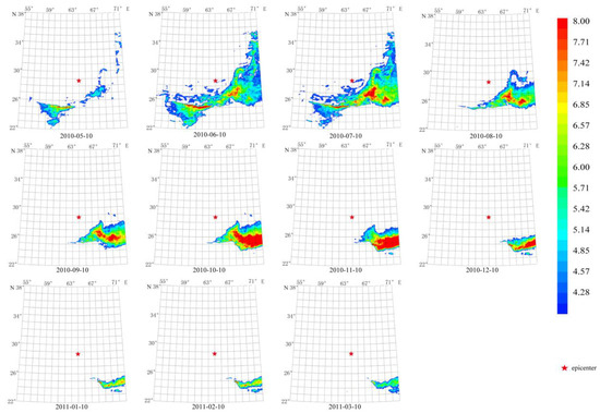 Temporal and spatial evolution of long-term thermal radiation anomaly of strong earthquakes. Single earthquake: E 28.78° N, 63.95° E, Mw 7.2, 18 January 2011. Wavelet transform: seventh order using Daubechies wavelets. Window length of FT power spectrum using Welch’s method: 512 days. Characteristic period: 256 days.