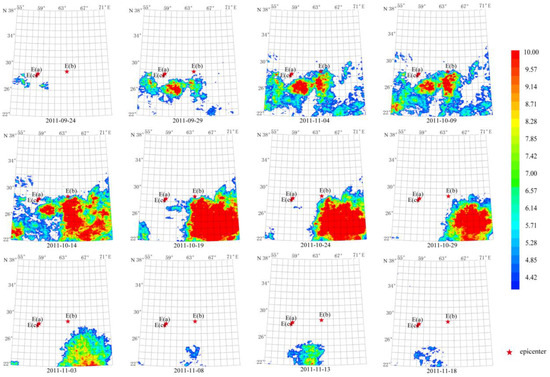 Compared to Figure 10, the anomaly in Figure 9, with a short characteristic period of 13 days, appeared 40 days pre-earthquake, reached the maximum when the earthquake occurred, and disappeared in 15 days after the earthquake. In addition, the anomaly area is much larger with the epicenter in the center, while in Figure 10, the anomaly appeared 45 days before the earthquake, and already started waning at the earthquake occurrence, and completely disappeared in the 10 days post-earthquake. The anomaly is more concentrated with the epicenter lying at its right edge.